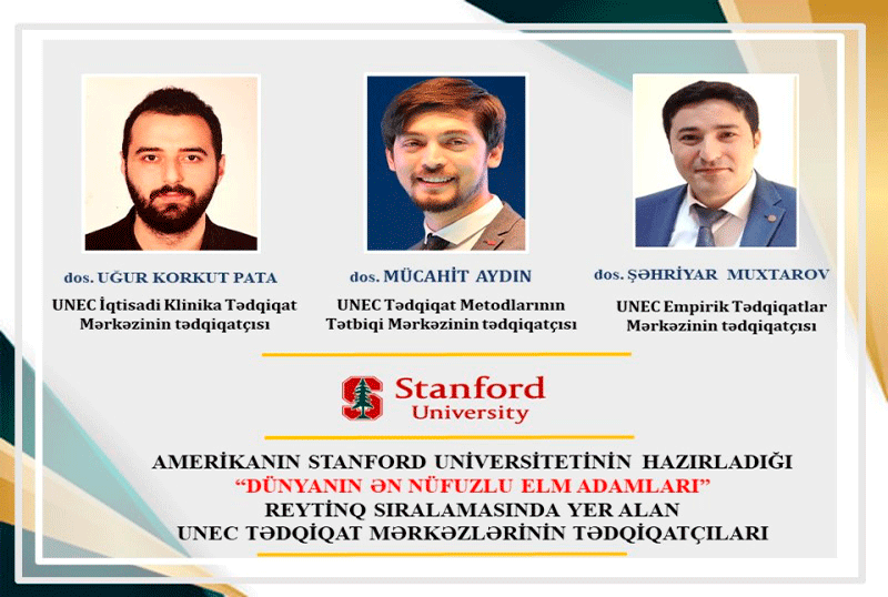 Dünya elm adamlarının fəaliyyətinin qiymətləndirilməsi məqsədilə hazırlanan siyahıda UNEC-in İqtisadi Klinika Tədqiqat Mərkəzinin tədqiqatçısı dos.Uğur Korkut Pata, Tədqiqat Metodlarının Tətbiqi Mərkəzinin tədqiqatçısı dos.Mücahit Aydın və Empirik Tədqiqatlar Mərkəzinin tədqiqatçısı dos. Şəhriyar Muxtarov da yer alıblar.