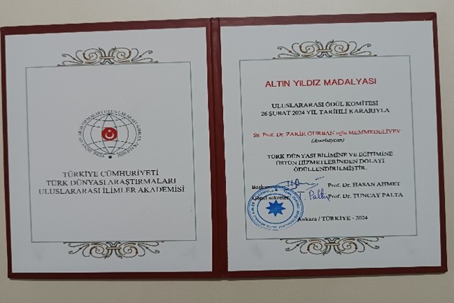 Türk26.02.2024 Dünyası Araşdırmaları Beynəlxalq Elmlər Akademiyasının “Altın Yıldız” medalı ilə təltif edilmişdir (26.02.2024-cü il).